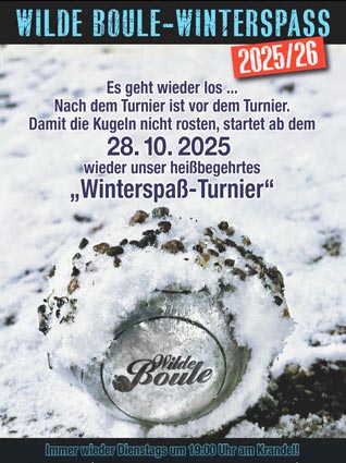 Das Ende der Krandelage bedeutet auch den Beginn unserer Winterserie, die bis zum 24.März 2026 läuft. Somit starteten am 28.10.2025, nachdem der Regen aufgehört hatte, 16 Bouler/innen den Winterspass. Und als erste Sieger konnten sich 2 Dreifachgewinner und 1 bester Zweifacher feiern lassen. Auf dem 3. Platz mit 2 Siegen (+19) konnte sich Peter Teichmann etablieren. Den 2. Platz mit 3 Siegen (+18) erspielte sich Hannes Dänekas. Den Tagessieg mit 3 gewonnenen Spielen (+21) eroberte Peter Gaidies.